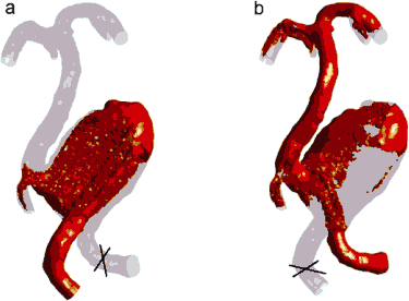 In some cases the flow fields resulting from alternative surgical options are dramatically different. For example, Figure 1 is showing the CFD-predicted transport of a virtual contrast agent in a large aneurysm for two treatment scenarios: clipping of one or the other supplying artery. The contrast flow animation shows that clipping the left feeding vessel (a) would result in a strong jet entering the aneurysm. If the right feeding vessel is clipped (b), the contrast quickly flows into the downstream artery, while the flow residence time in the aneurysm is increased. The later scenario is likely to promote aneurysm clotting.