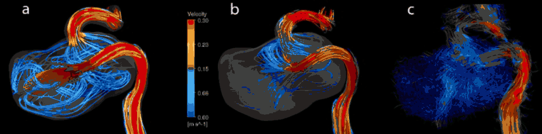 Another patient's aneurysm was proposed for treatment by a flow diverter device. Numerical simulations of the preoperative and postoperative flow fields are shown in Figure 2 (a) and (b). The simulations predicted that deploying a flow diverter would eliminate a high velocity jet and lead to substantially reduced velocities in the aneurysm. These computational results were validated by experimental measurements conducted in a patient-specific flow phantom where an actual flow diverter device was deployed (Fig. 2c).