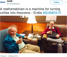 Edgar was part of the jury for my PhD defense in 2012 and, owing to his knowledge on the topic and his taste for rigor and quality, he was a feared reviewer. A few minutes into my presentation, the unexpected happened: Edgar fell asleep! Perhaps was I not interesting enough? The question was upstaged by the relief of knowing that he was to miss all the imperfections in my presentation. Then came the questions and the unexpected happened once again: Edgar woke up and asked me the most arduous question! So, now you know why I got Edgar a capuccino before the conference started—see photo—it is so that he does not fall asleep and then ask arduous questions!