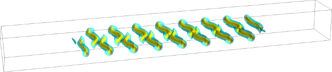 Figure 1: Spatially localized state of plane Couette flow triggered by the motion of the top and bottom walls in the streamwise direction, i.e., across the screen. The state is represented by isocontours of the streamwise velocity.