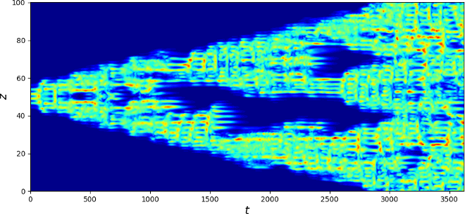Figure 2: Space-time plot representing the kinetic energy of the disturbance from the laminar flow represented as a function of the spanwise coordinate, z (corresponding to the horizontal axis in figure 1), and of the time, t. Blue (resp. red) indicates zero (resp. maximum) departure from the laminar flow.